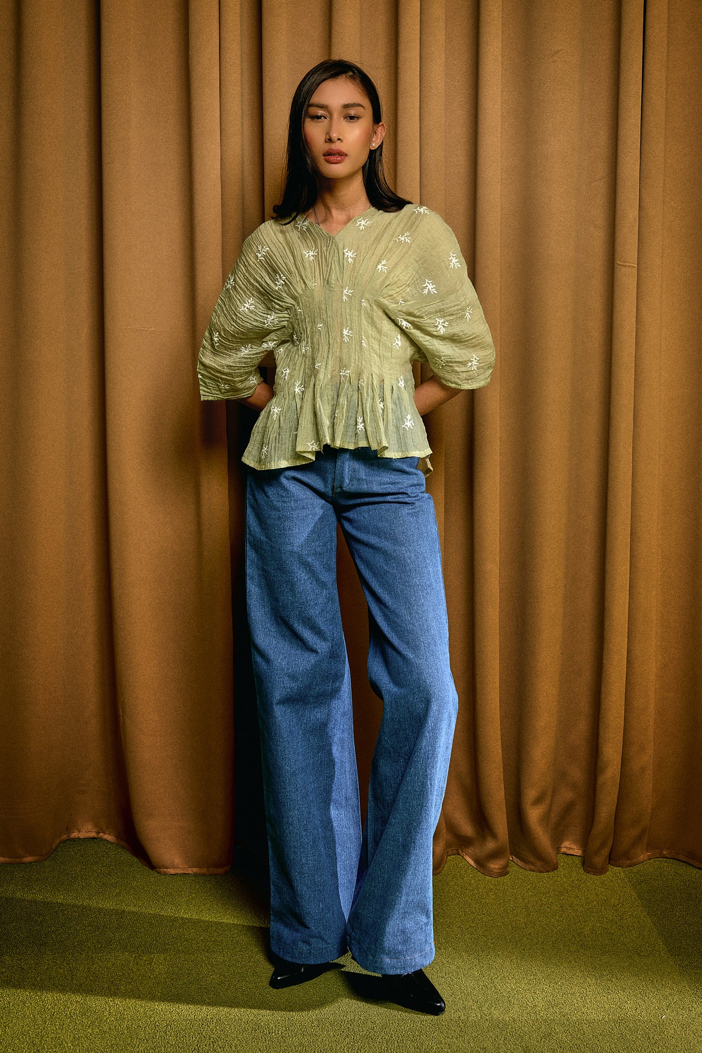 Fully embroidered details whisper of depth and complexity, like the stories Alys carries but never tells. Batwing sleeves soften her edge, offering grace without fragility — she floats through rooms, but her silence leaves echoes. The V-neckline, framed with subtle pleats, draws you in, elegant yet guarded, hinting at truths she won’t say out loud.