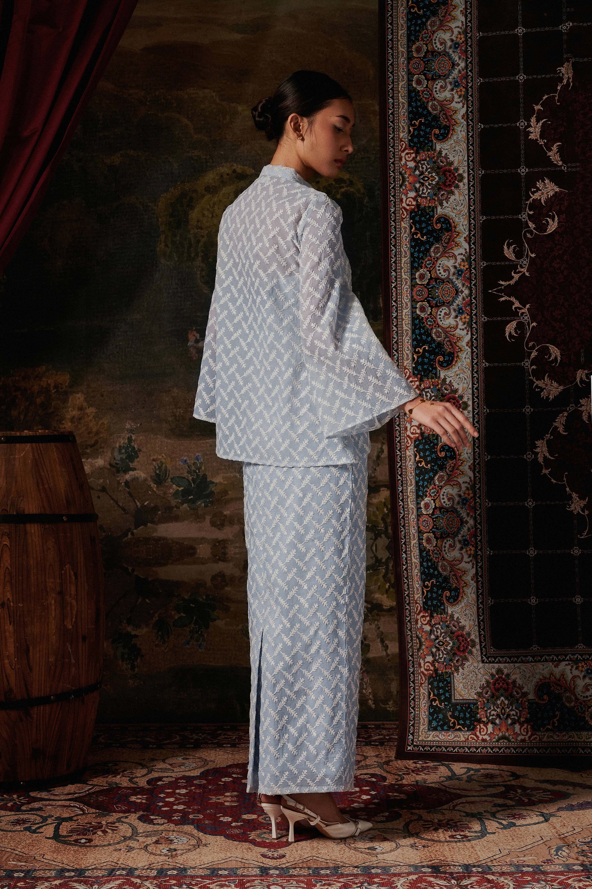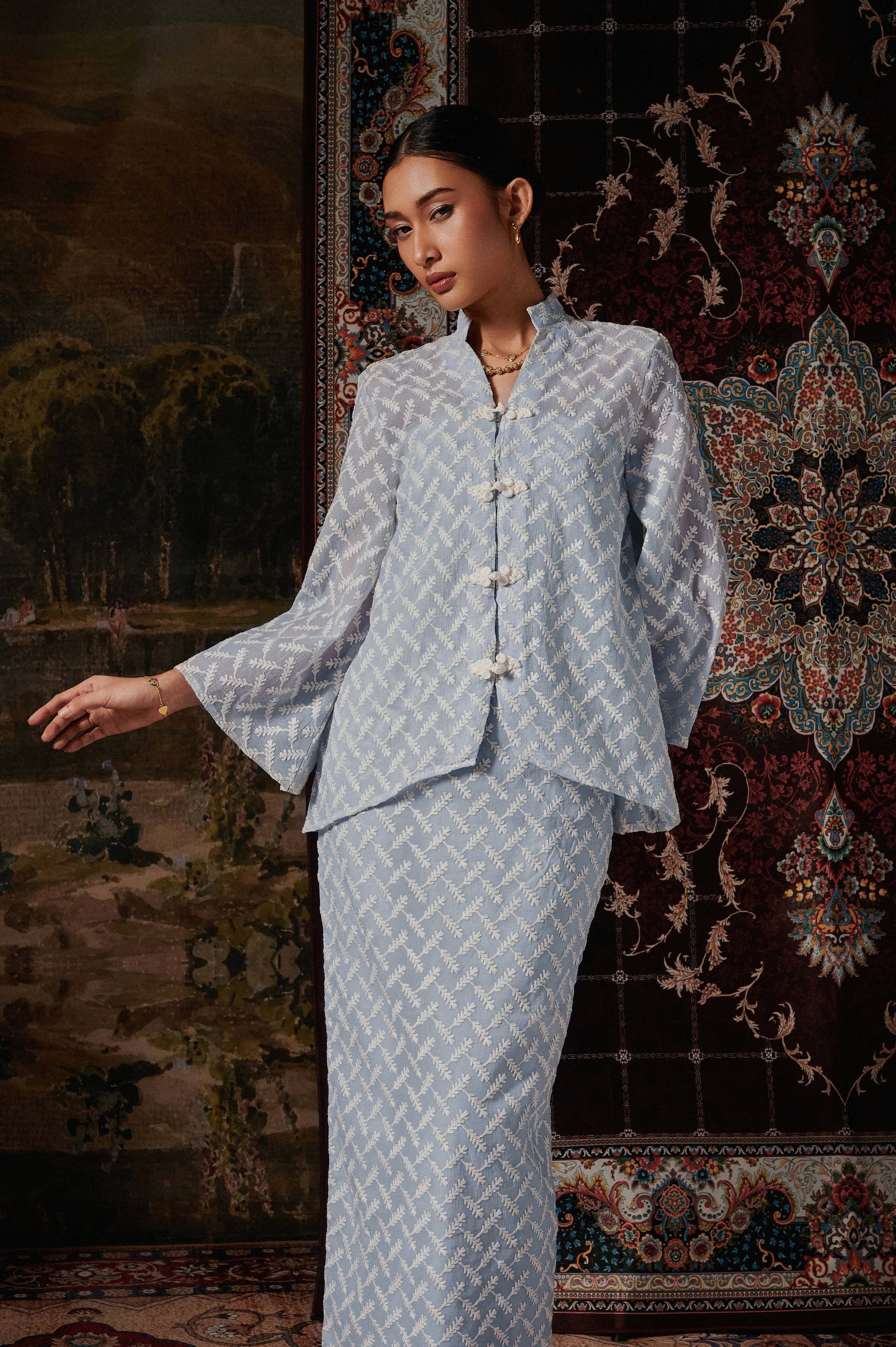Designed in a newly contemporary fusion silhouette of Kurung Kedah and classic Kebaya, the outerwear top carries the elegance of heritage with a modern enchantment. A classic mandarin collar frames the neckline like a noble crest, secured with a contemporary mandarin frog button that feels like an ancient seal closing a secret chapter. Crafted in fully embroidered chiffon organza, the fabric is light as mist, with embroidery that looks like delicate charms stitched into the air. The V-neckline with classic kebaya overlap shapes the front with graceful structure, while the classic length flare hem sleeves move like soft wings with every gesture. Finished with a high-low length, it creates a floating, elevated silhouette — modest, dramatic, and spellbound.
