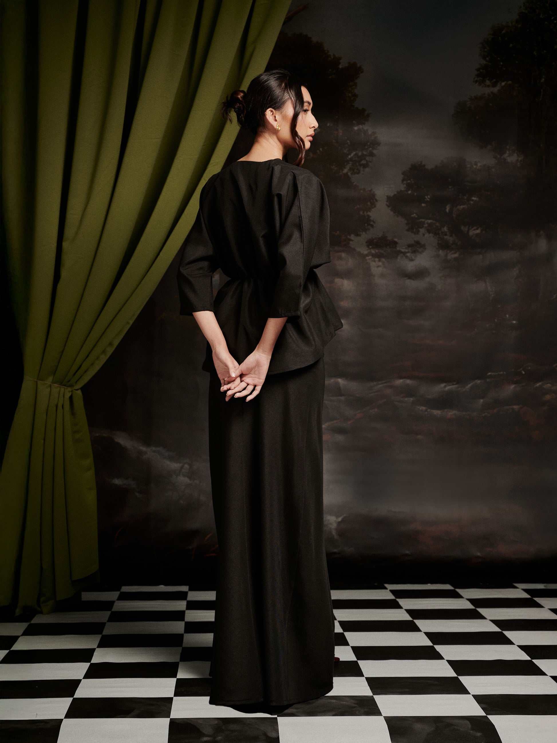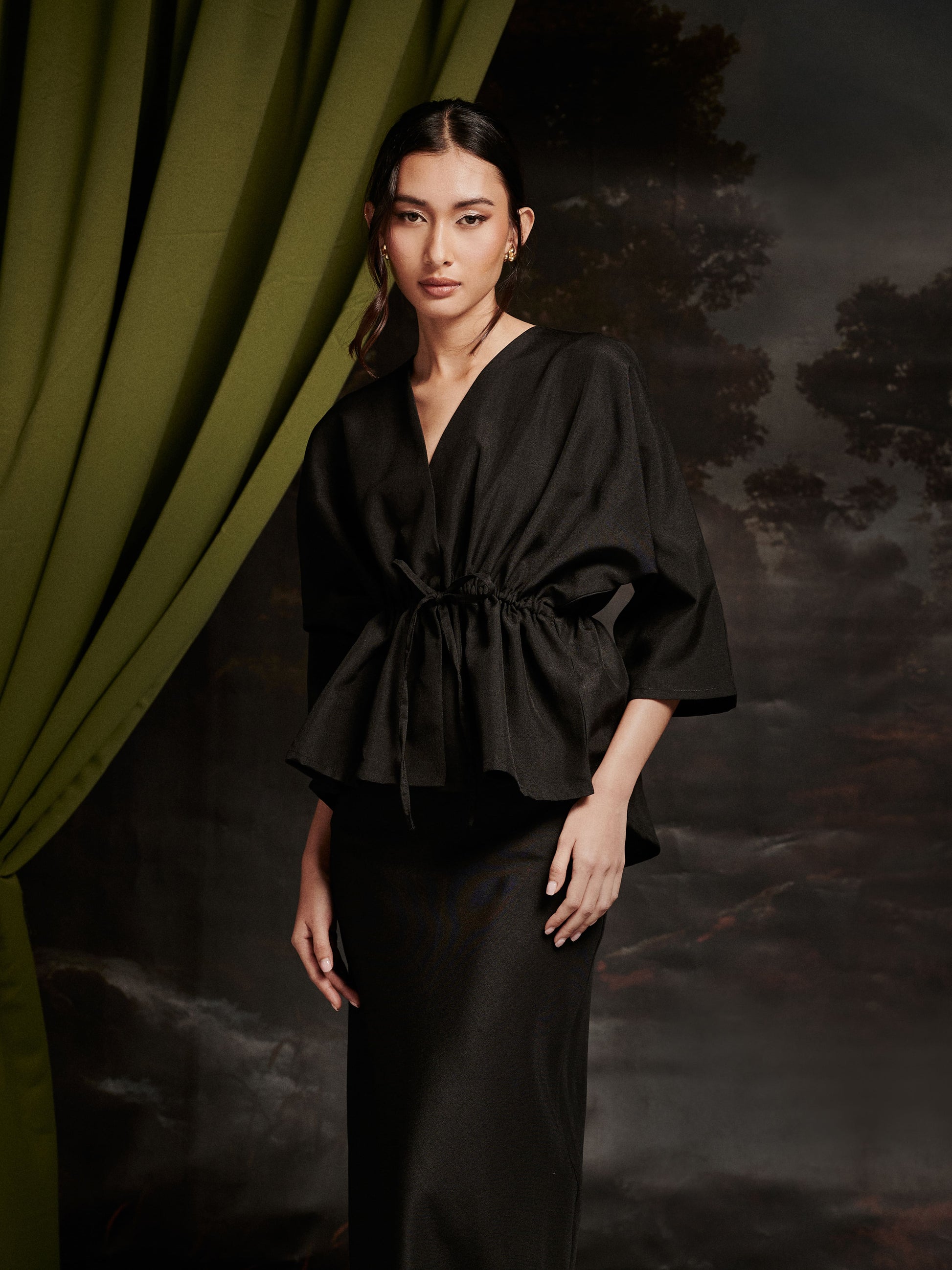 Unleash your inner Iracabell, the fiery and fabulous Amber Queen, with this dramatic ensemble that commands attention (and maybe a few “Off with their heads!” moments). The top is a bold statement piece, with an adjustable ruched waist cinched by a ribbon, perfect for showing off that royally exaggerated silhouette. The overlap V-neckline adds a touch of regal flair, while the stretchable back gathers keep you comfy during your grand declarations. The 3/4 batwing sleeves are ideal for waving dramatically or pointing your scepter, and the high-low length ensures you’ll always have the most regal swish in the room.