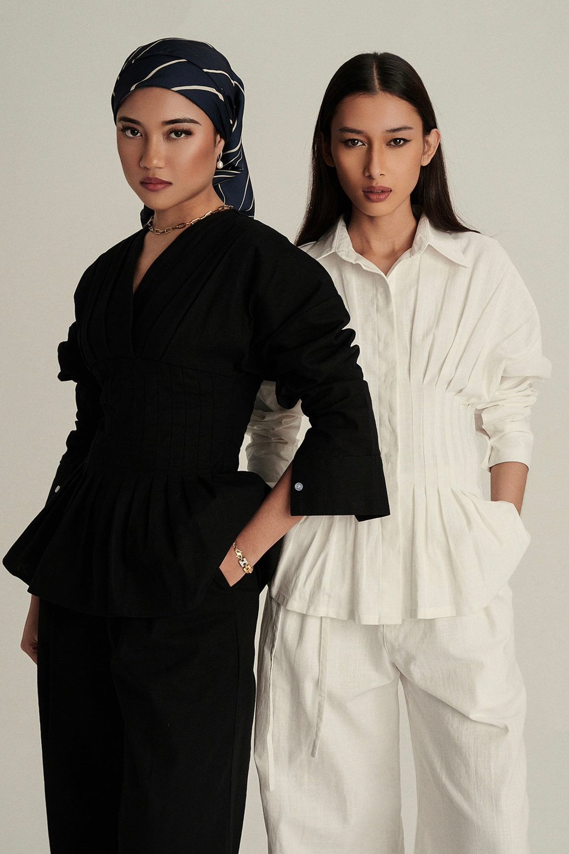 The Valerie Linen Top is a study in poised sophistication, with a signature inverted pleated waist that cinches gracefully, elevated draped pleats, and an overlap curved pleated V-neckline that frames the face with quiet confidence.