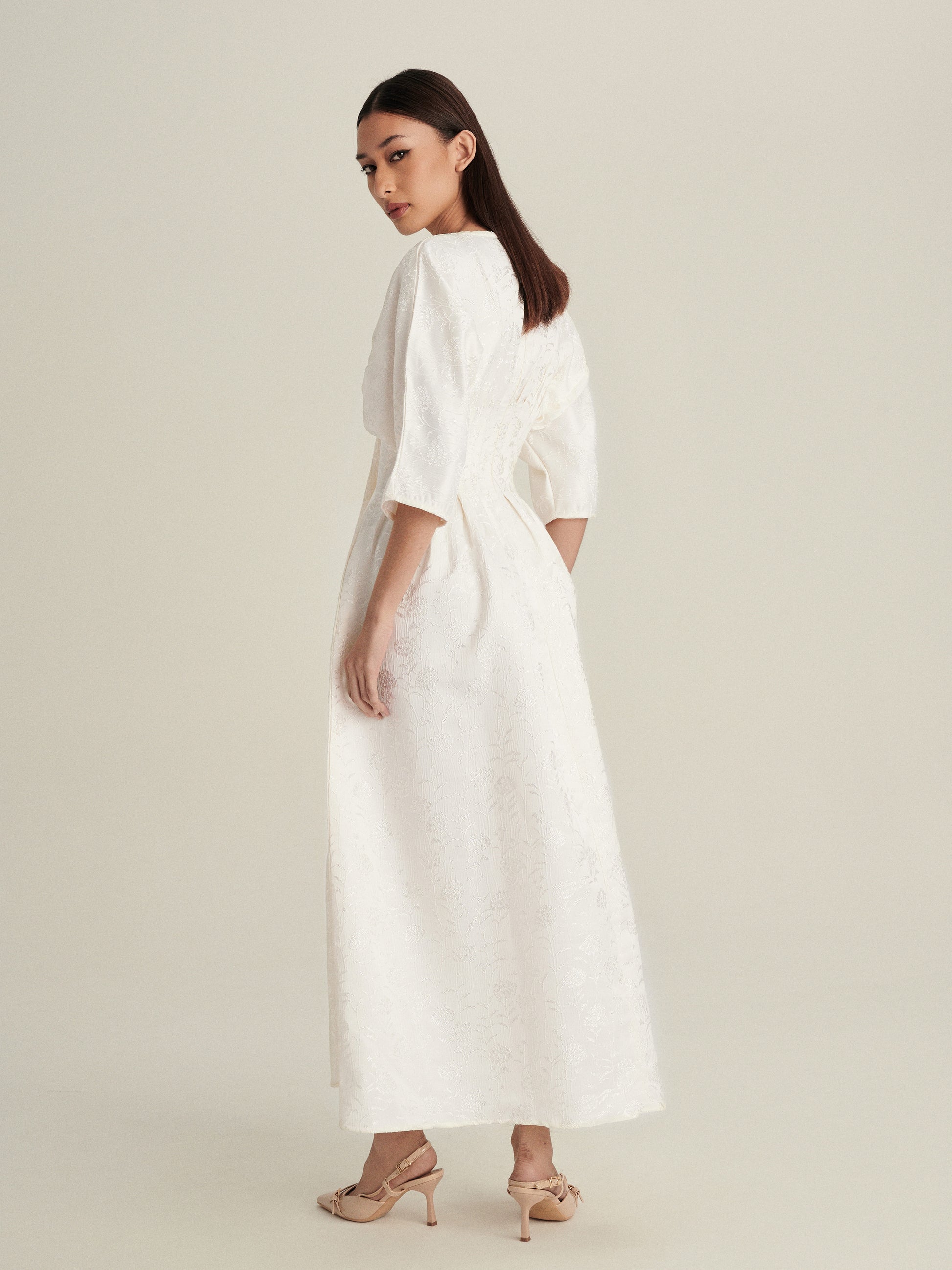 Cut in a 3D floral textured soft jacquard, the fabric blooms with depth and shadow, as if the dress itself holds two characters within: delicate in touch, powerful in presence.